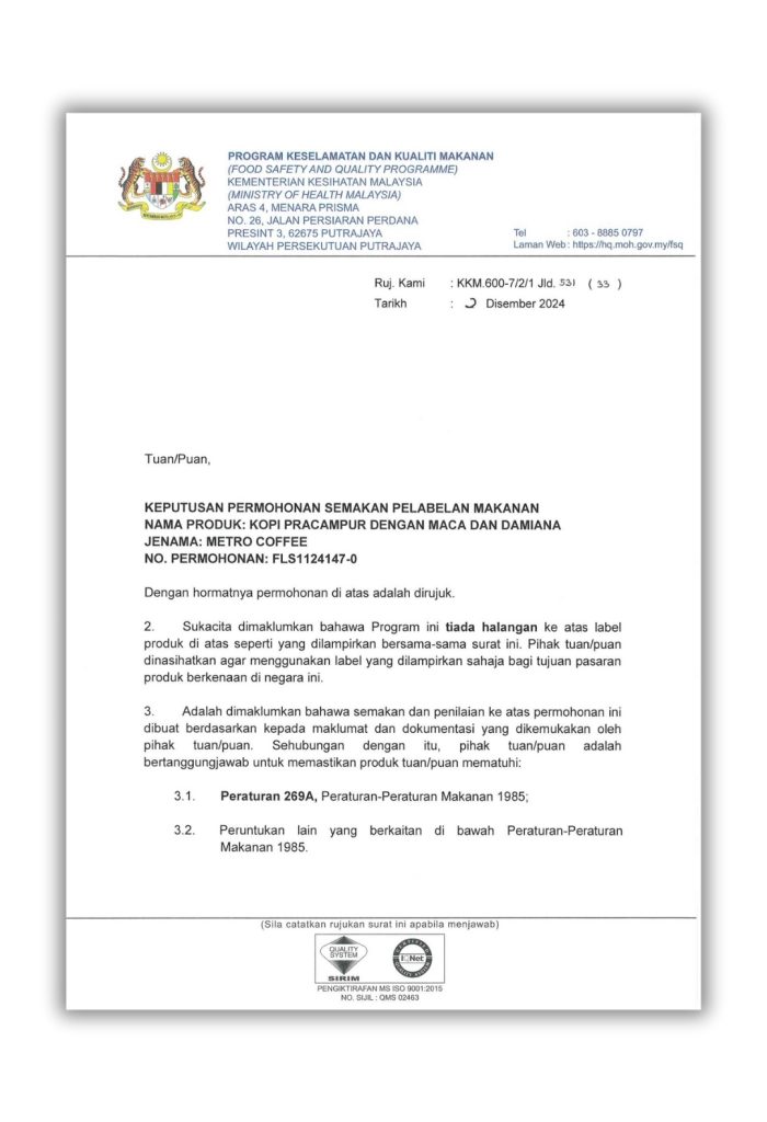 Kopi Metro berdaftar dengan KKM di bawah perlabelan makanan (MESTI)